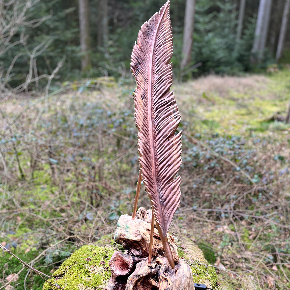 Feder aus Pflaumenholz, Ränder und Rückseite Kupfer lackiert, verbunden mit Kupferstäben, Sockel aus einer Wurzel, mit Kupferfarbe und indirekter Beleuchtung.