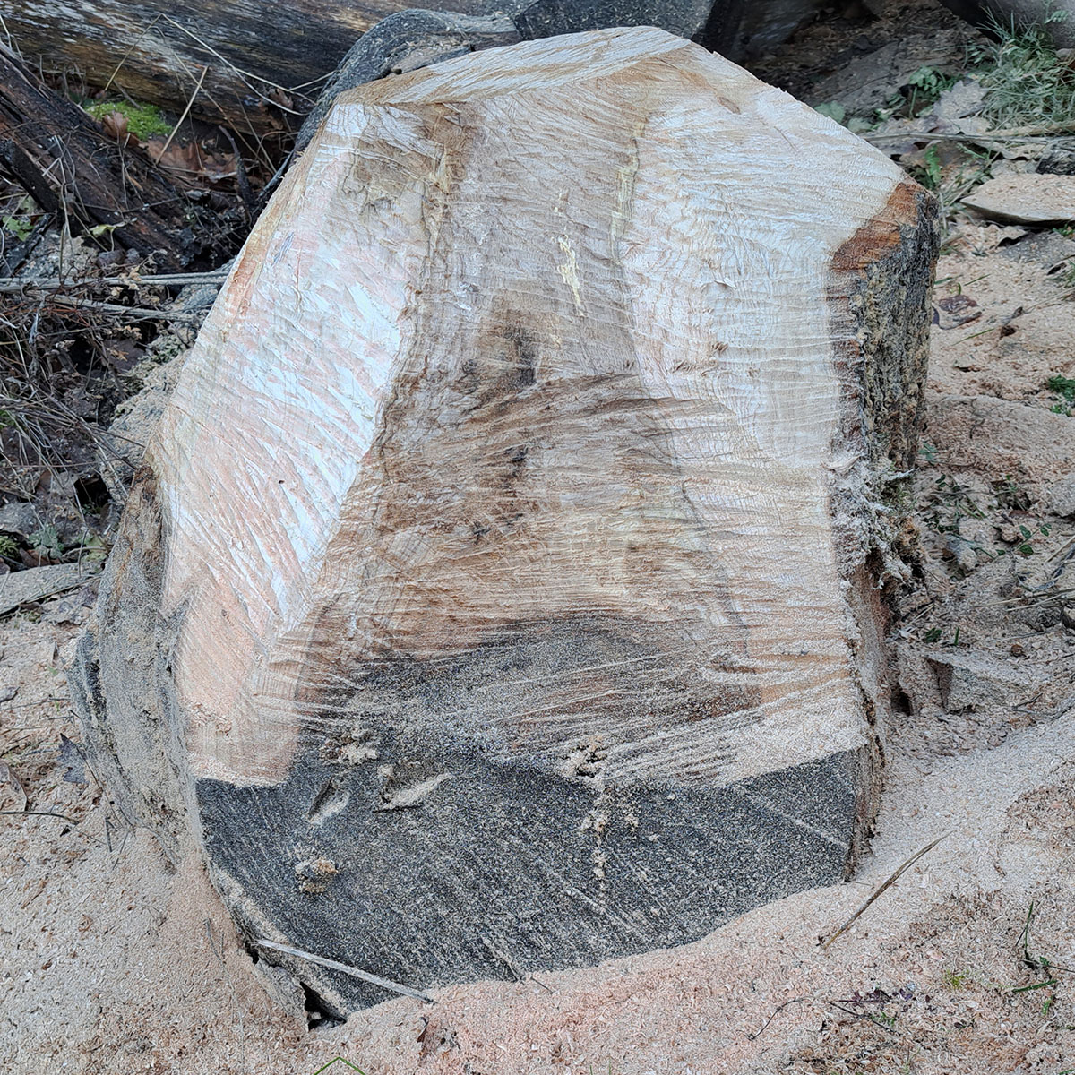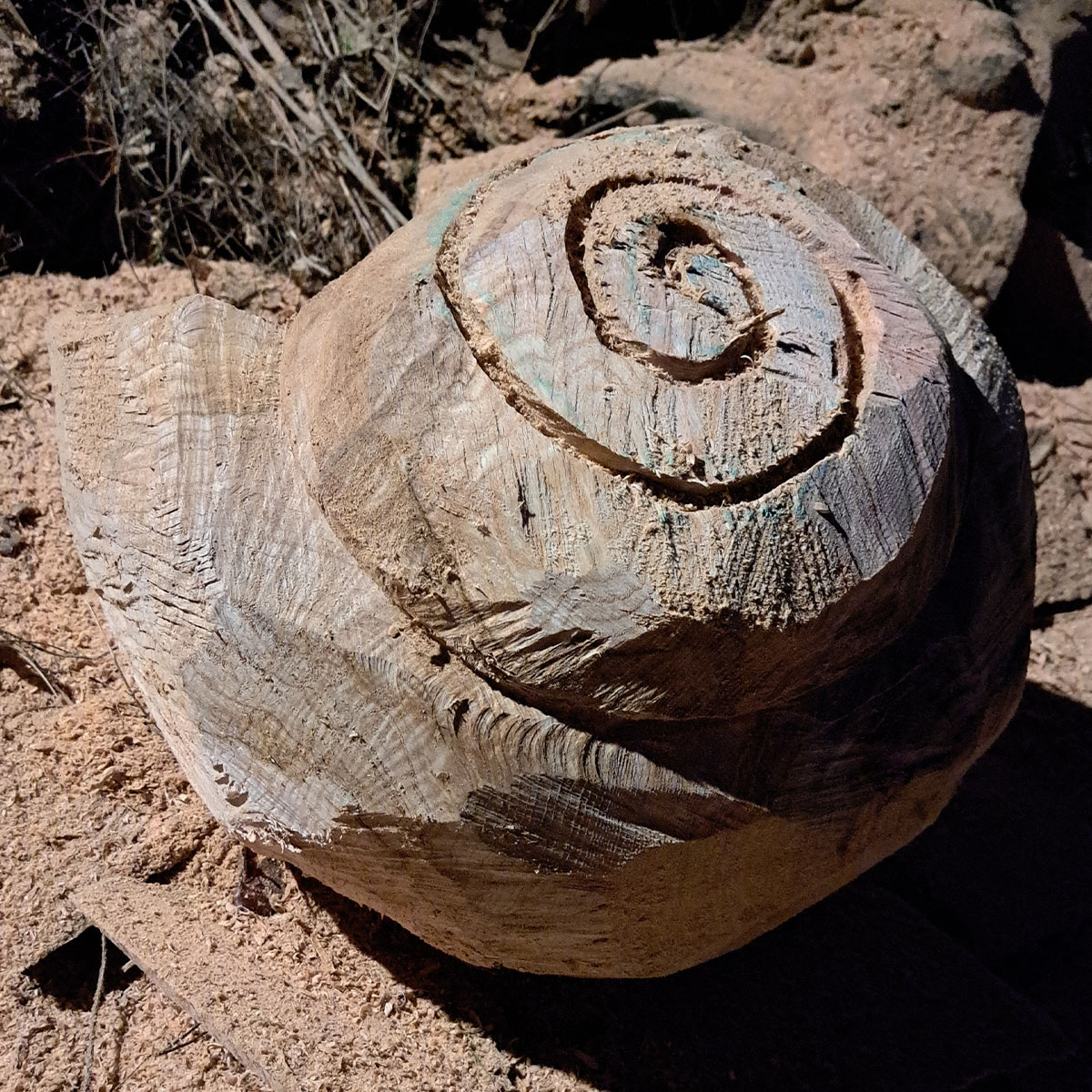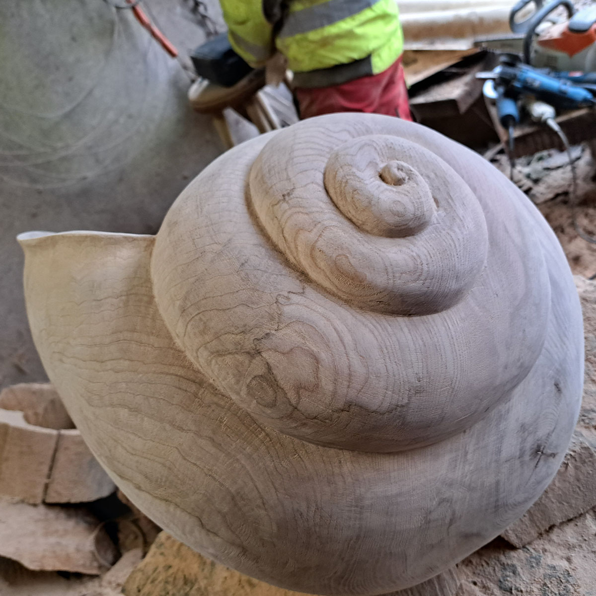 Mit viel Herzblut, Spaß bei der Arbeit in der Natur und viel Leidenschaft entsteht aus einem Teil eines Baumstammes ein schönes Schneckenhaus.